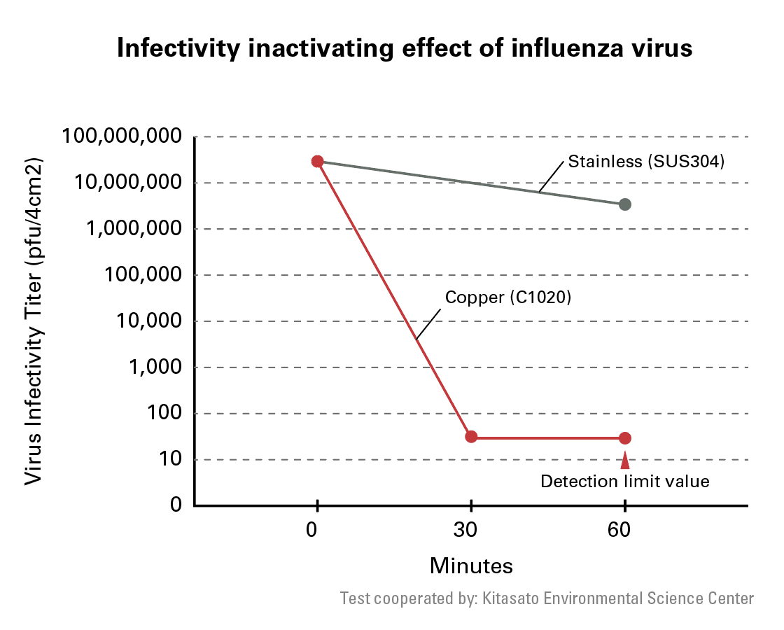 The trace metal action of copper ions has the property of killing bacteria. When the anti-virus test for influenza type A-virus was conducted at the Japan Copper Center, the virus that contacted the surface of copper decreased to less than the detection limit after 30 minutes of action.